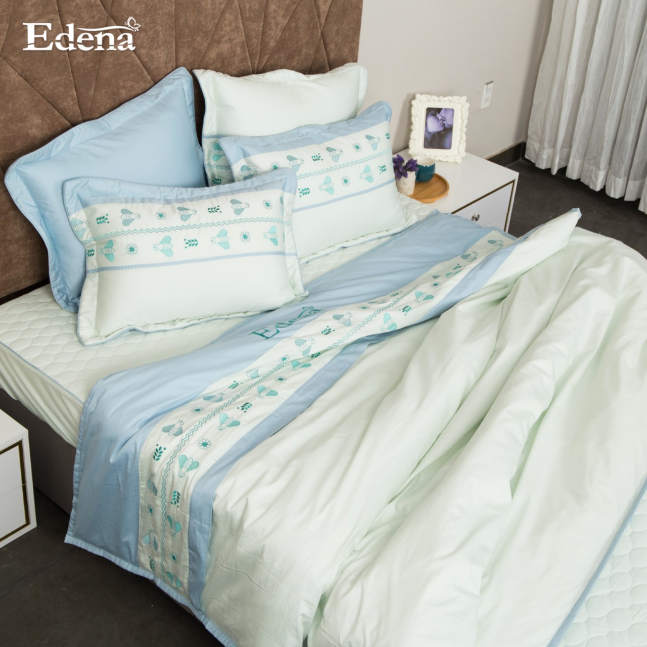 – Tone xanh hiện đại tươi mát đến từ chất liệu Cotton Đặc Biệt Edena. Không chỉ là chất liệu mát mẻ tự nhiên, qua sự kết hợp giữa màu sắc cùng họa tiết một cách hài hòa và đậm chất tươi mát, bạn sẽ còn cảm nhận được hương sắc của thiên nhiên tại chính căn phòng mình.
